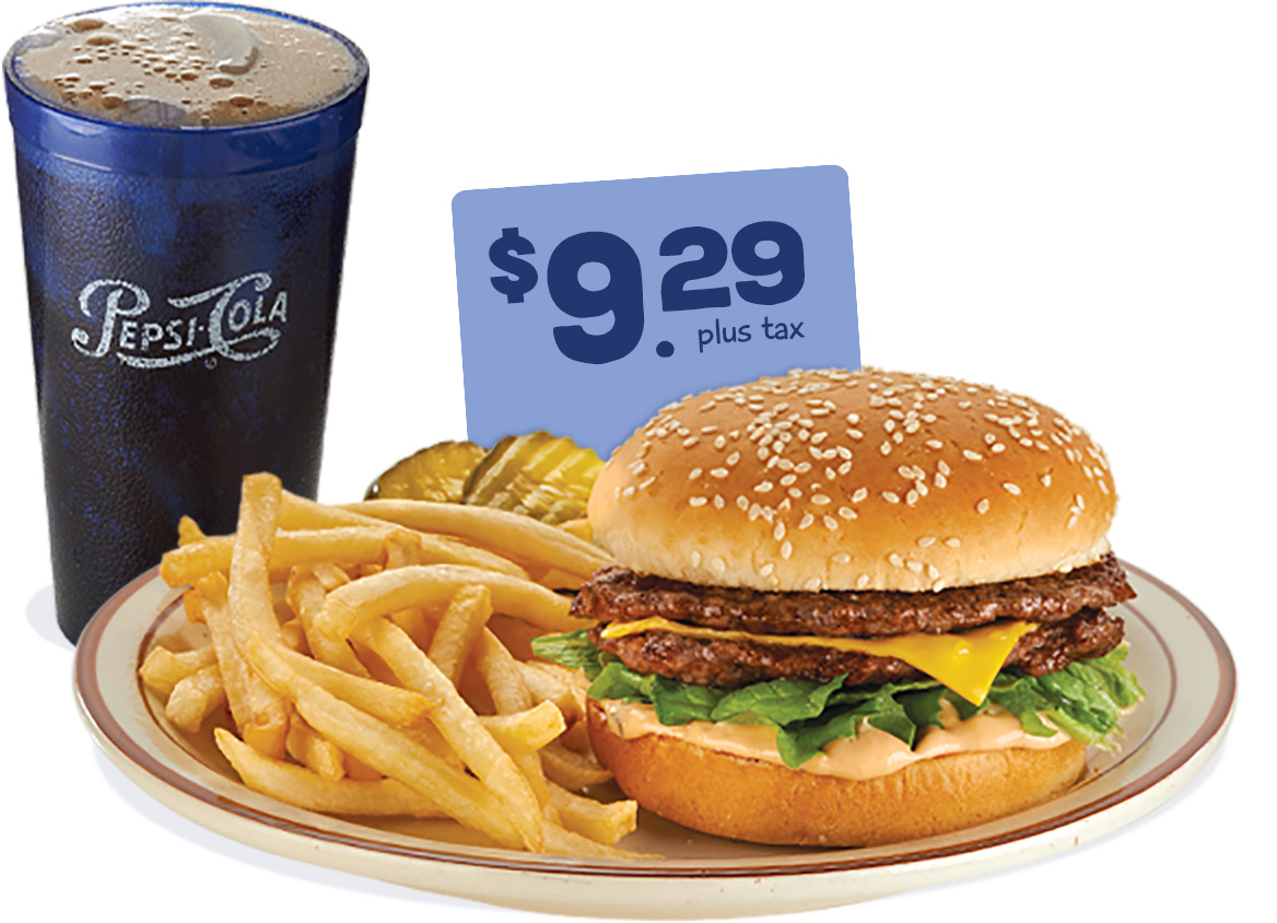 Satisfy your heroic hunger with our Super George Value Combo. Our delicious double cheeseburger is topped with American cheese, lettuce and Thousand Island dressing, and served with your choice of fries, soup or hashbrowns. Includes fountain soda or coffee.That’s a super-powerful combo!
