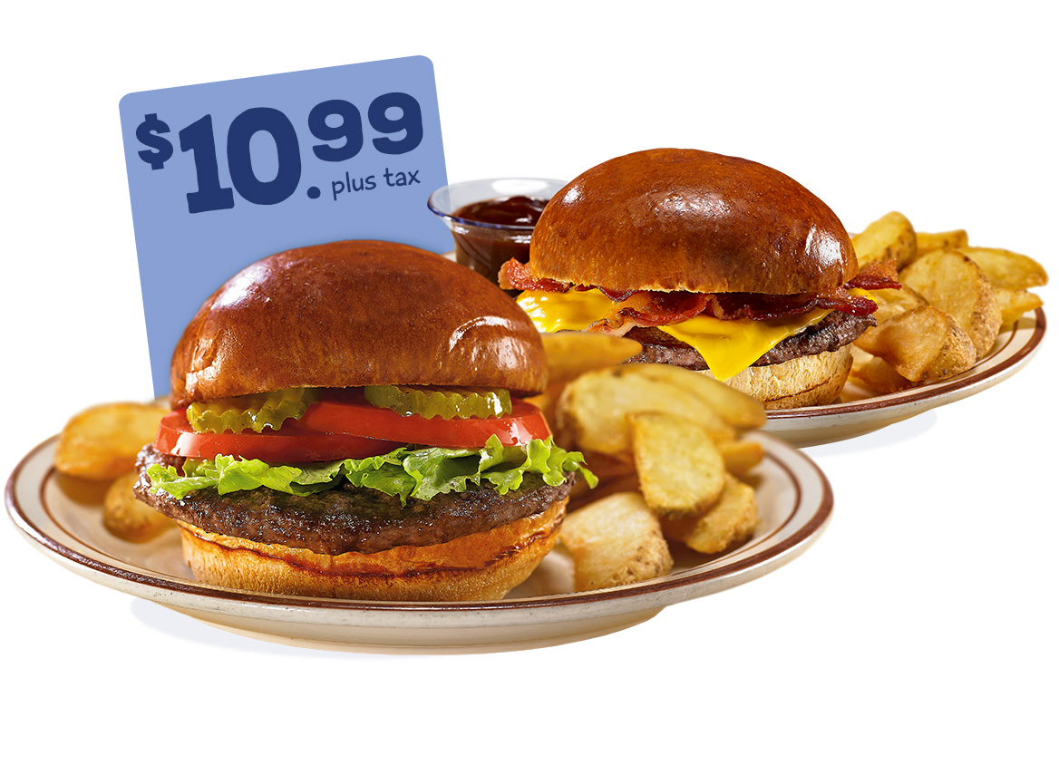 Treat yourself to one of our special Premium Burgers. Choose from The 1948, Ultimate Super George, Mushroom Swiss, Pub Burger, or All-Star Cheeseburger served on a buttered bun with a stack of skin-on potato wedges. You deserve it!
