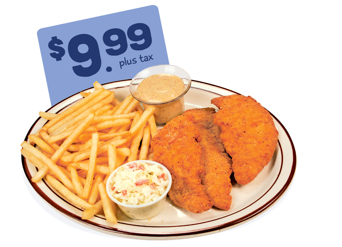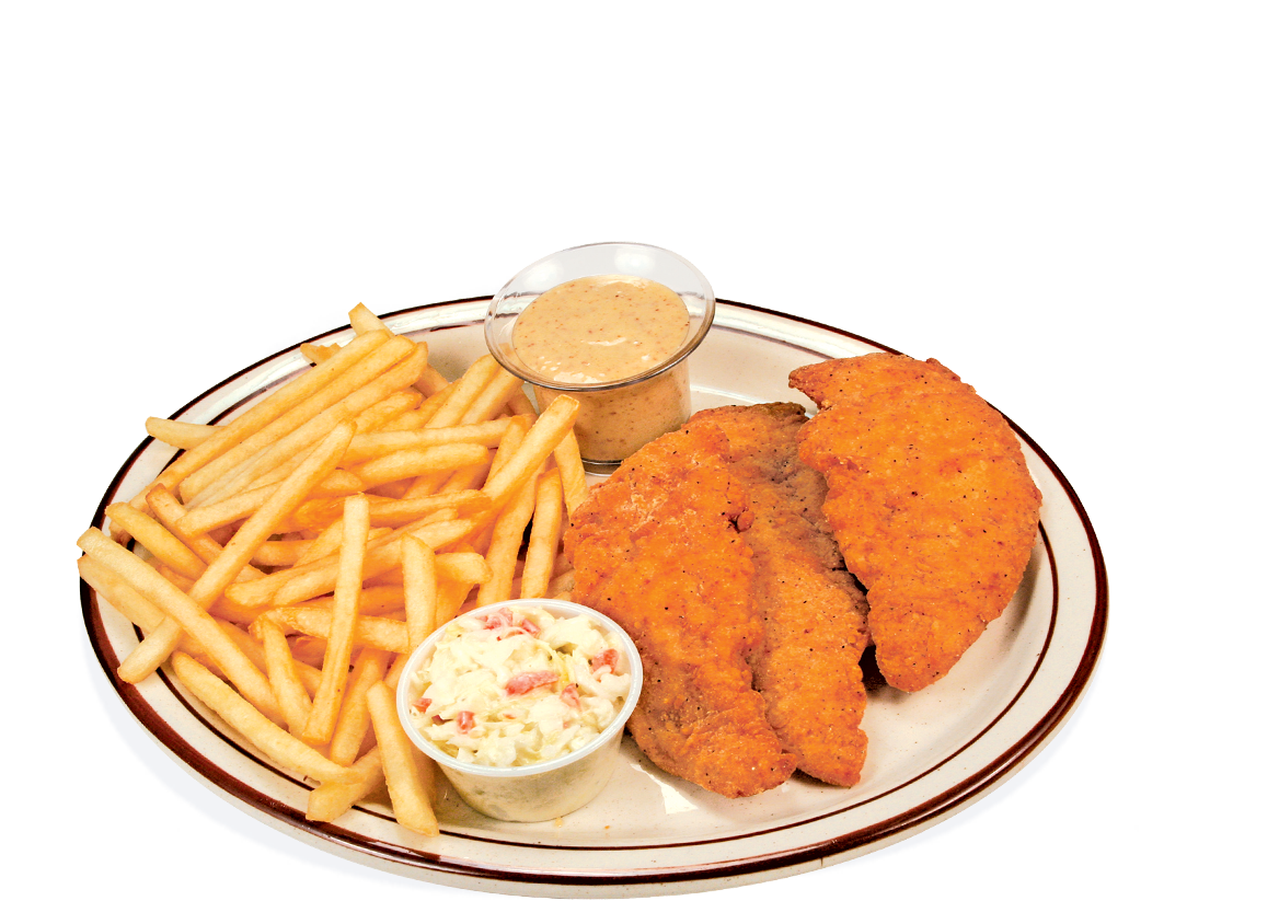 Cock-a-doodle-do your taste buds a favor & try our lightly breaded, all-white meat chicken tenders. No bones about it, our tenders are Grade-A tasty, especially with our honey mustard dipping sauce, fries, & coleslaw on the side.